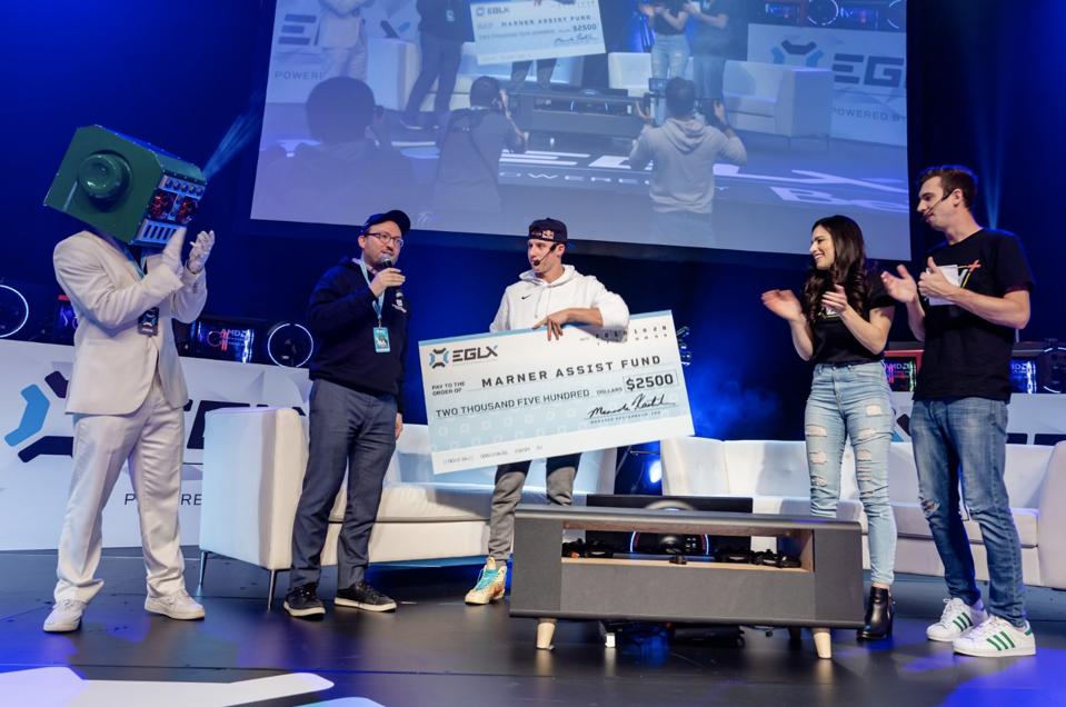 Kestenbaum presents NHL player Mitch Marner with a check for his Fortnite charity match against a gamer from Chai Lifeline, a nonprofit working with cancer patients. Destructoid’s mascot and the Kinda Funny Games team look on. Enthusiast Gaming. Used by Permission.