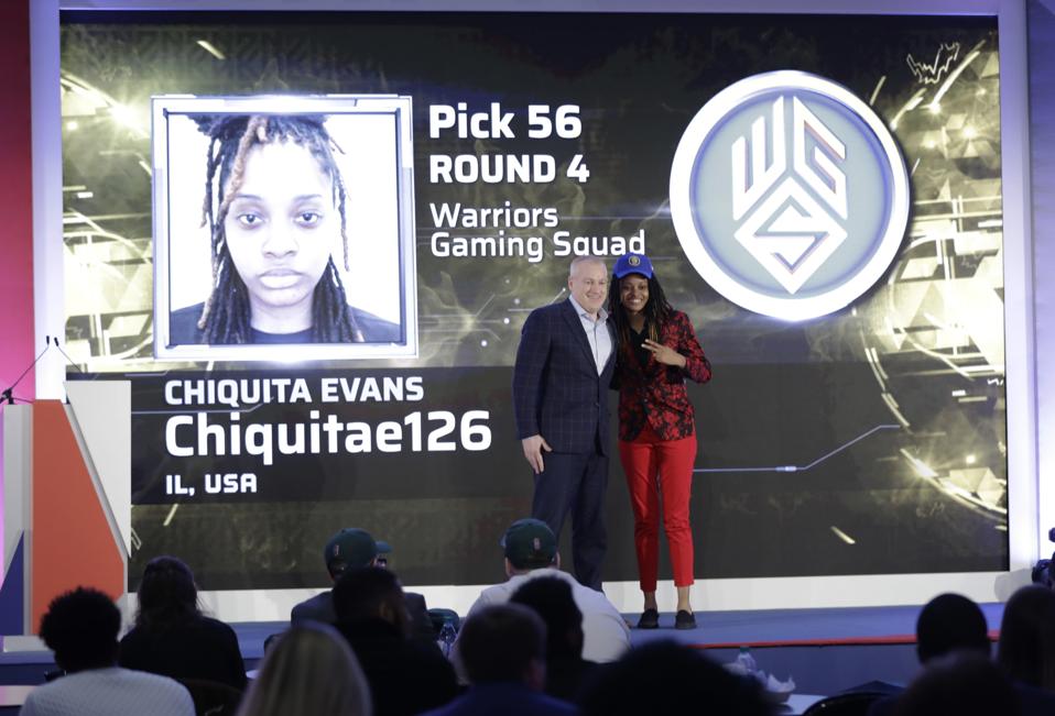 The esports NBA draft: Chiquita Evans poses for photographs with Brendan Donohue after being selected as the 56th pick overall by the Warriors Gaming Squad for the NBA’s 2K League on March 5, 2019, in New York. Frank Franklin II/ASSOCIATED PRESS