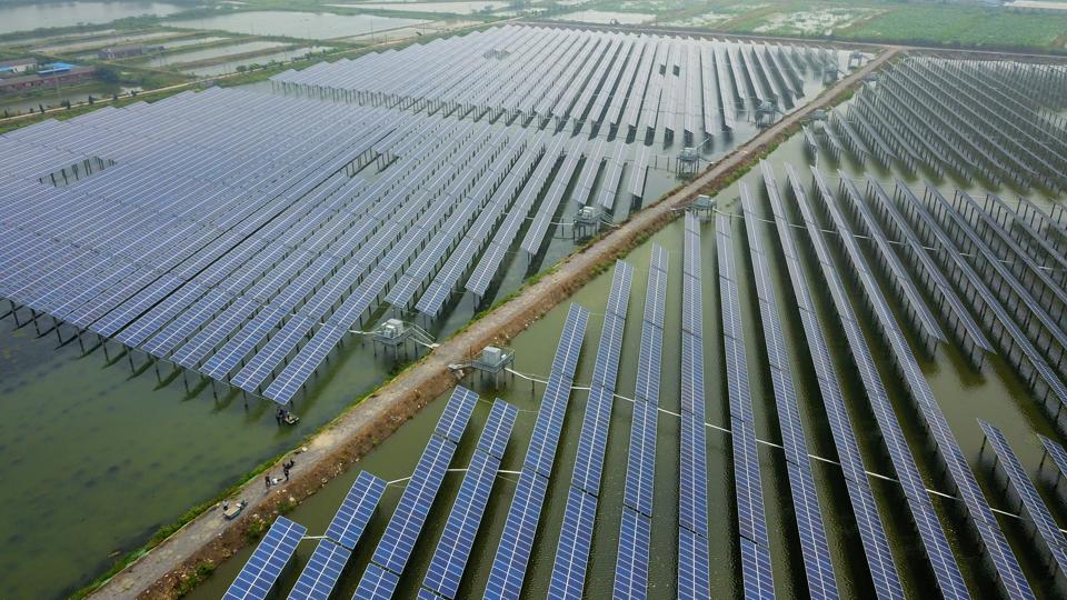 YANGZHOU, CHINA – JUNE 24: Aerial view of fishermen catching crayfish next to photovoltaic solar panels at a fishery-solar hybrid photovoltaic power station on June 24, 2019 in Yangzhou, Jiangsu Province of China. (Photo by Meng Delong/VCG)