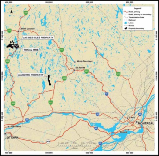 The Project consists of contiguous claim blocks totaling 29 km2 situated approximately 53 km SE of the Lac-des-Îles mine, formerly known as the Timcal mine, North America’s only operating graphite mine currently owned by Imerys Carbon and Graphite. It is accessible by driving NW from Montreal for a distance of approximately 170 kilometres.